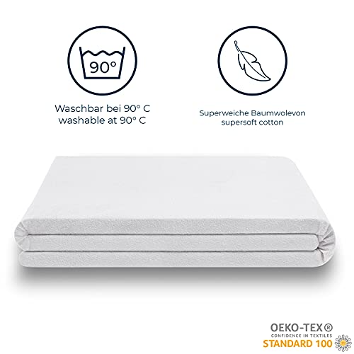 180 x 200 cm waterdichte matras- en kussenbeschermer. Matrasbeschermer. ✓ Oppervlak van 100% natuurlijk katoen – bijzonder zacht en absorberend ✓ op maat gemaakte matrasbeschermers ✓ Lange levensduur – kan meer dan 100 keer worden gewassen ✓ Ook geschikt voor bijzonder lange of diepe matrassen ✓ wasmachinebestendig, geschikt voor de droger. ✓ Beschermt tegen vlekken door gemorste vloeistoffen, zweet of bednatten ✓ comfortabel, irritervrij, voor een rustige nachtrust. ✓ Waterdicht, ademend.